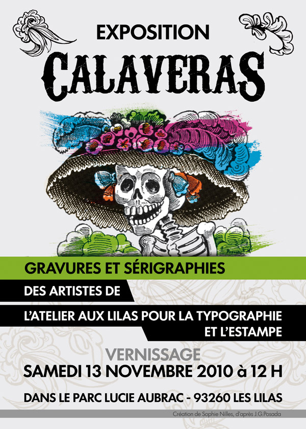Les artistes de l'Atelier au Lilas pour la typographie et l'estampe placardent leurs calaveras sur les murs du parc Lucie Aubrac aux Lilas, à l'occasion de la Toussaint.