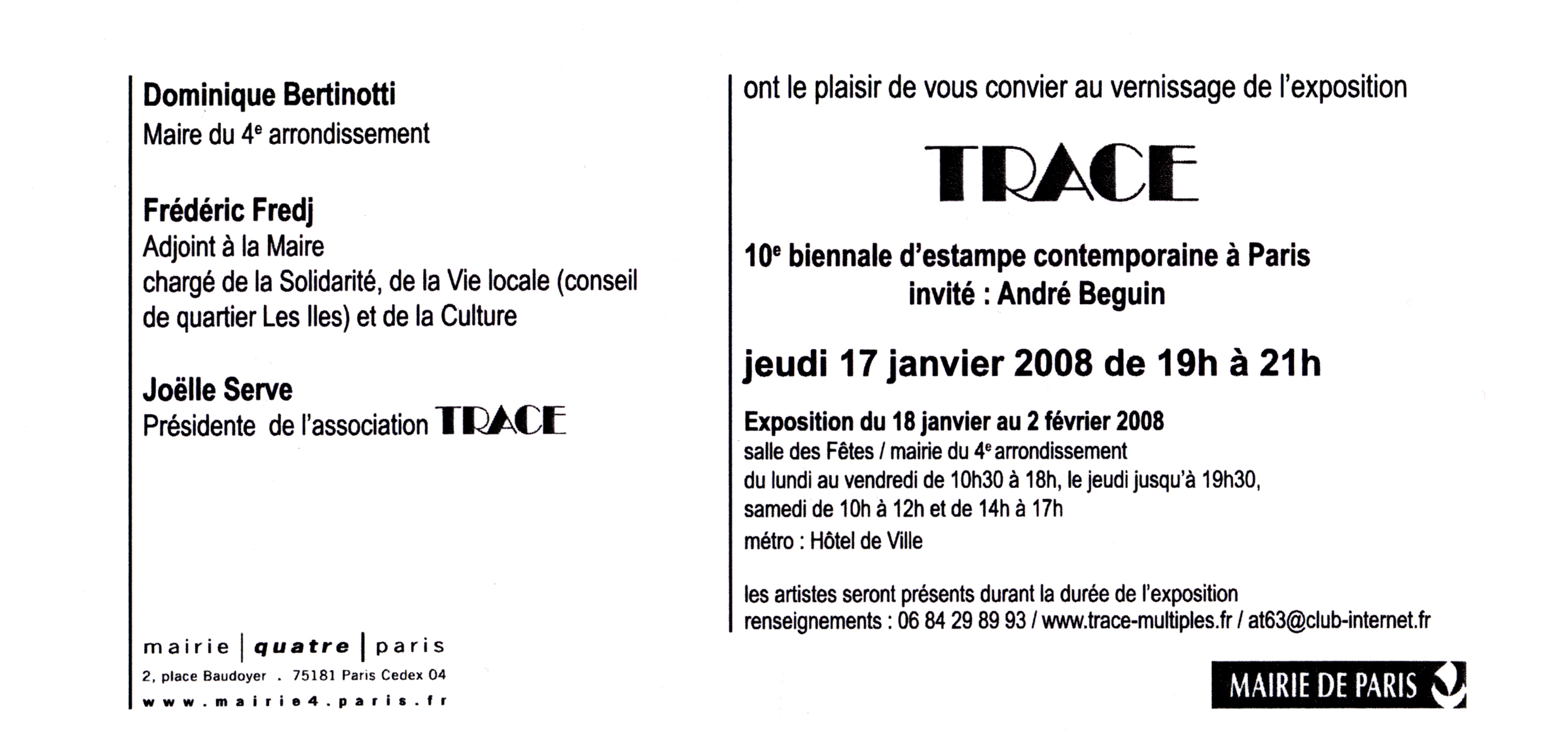 Vendredi 18 Janvier 2008-Samedi 02 Février 2008 Exposition de l'association Trace. Series Présentées: Fictions de Jorge Luis Borges Téléchargez le flyer: 2008-01 TRACE PARIS4.jpg (735.34 Ko) Adresse Mairie du 4e 2 place Baudoyer 75004 Paris France