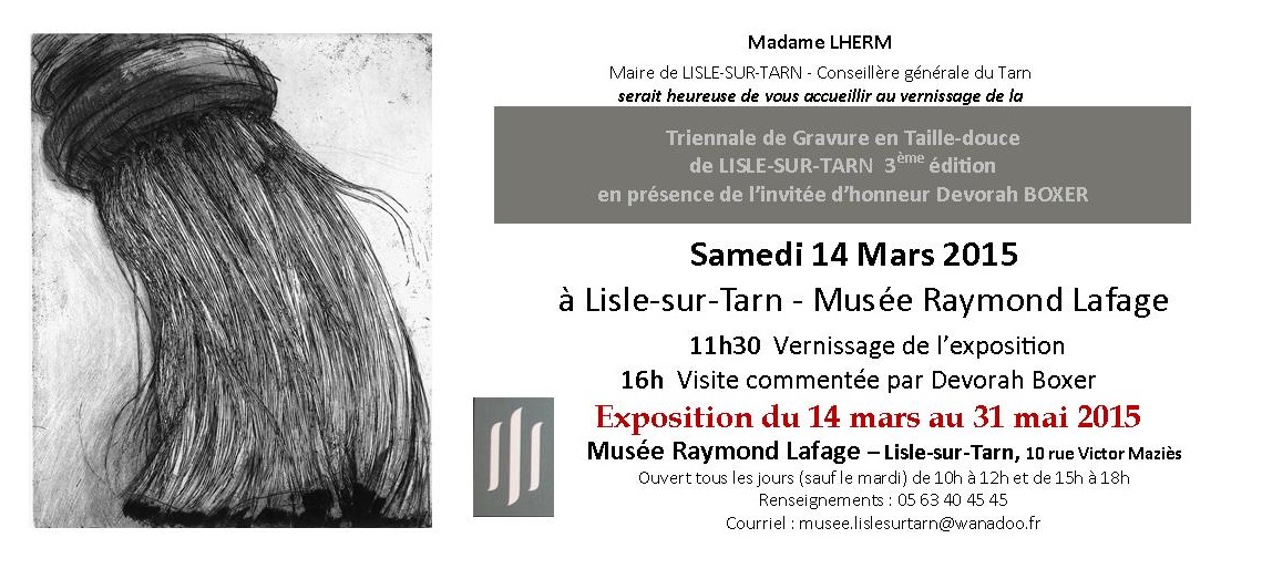 3e triennale de gravure en taille douce organisée par le musée Raymon Lafage à Lisle-sur-Tarn, en Midi-Pyrénées. Invitée : Devorah Boxer.