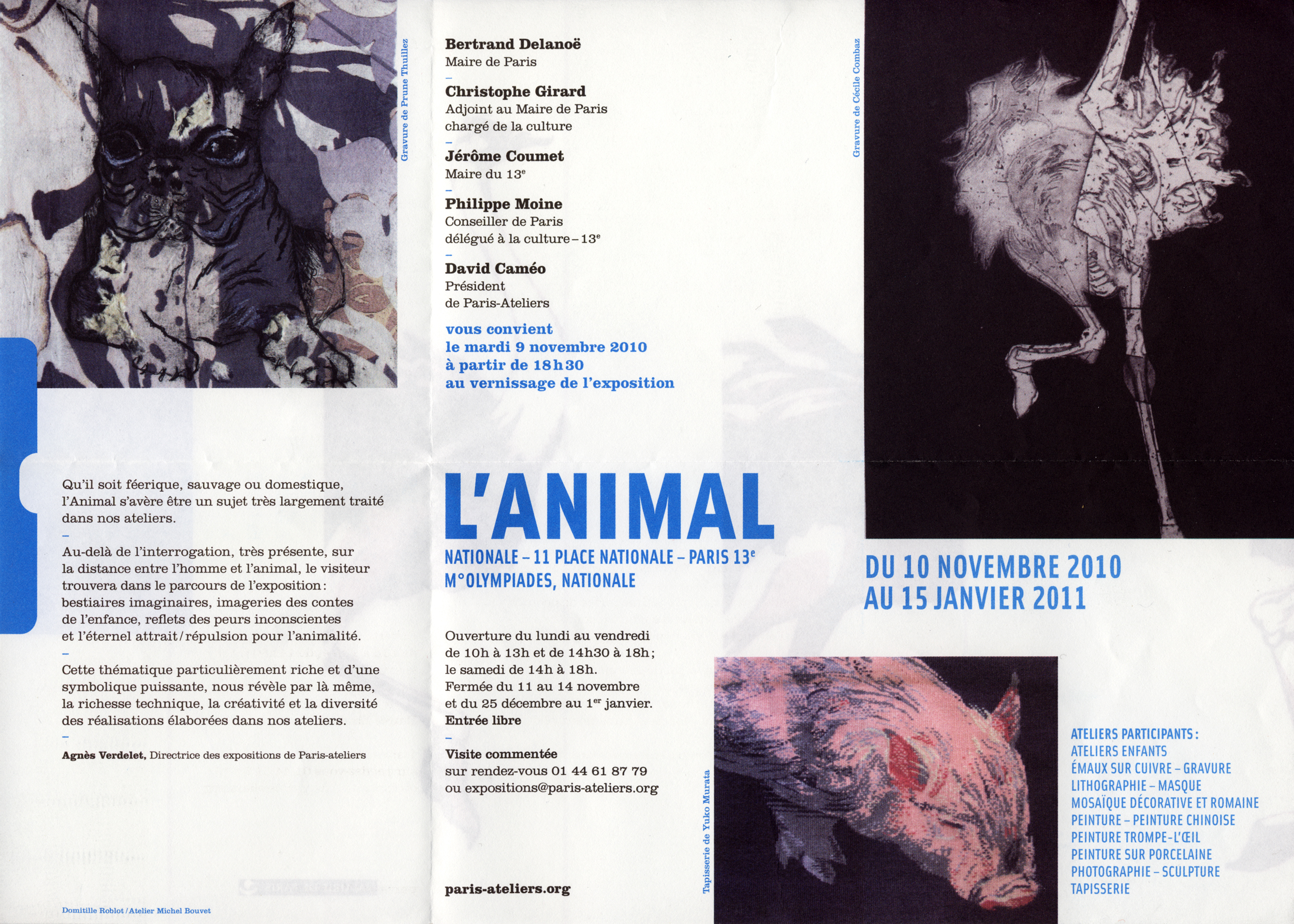 Exposition des élèves de Paris-Ateliers sur le thème de l'animal. Mes autruches font l'affiche et le billet d'invitation.