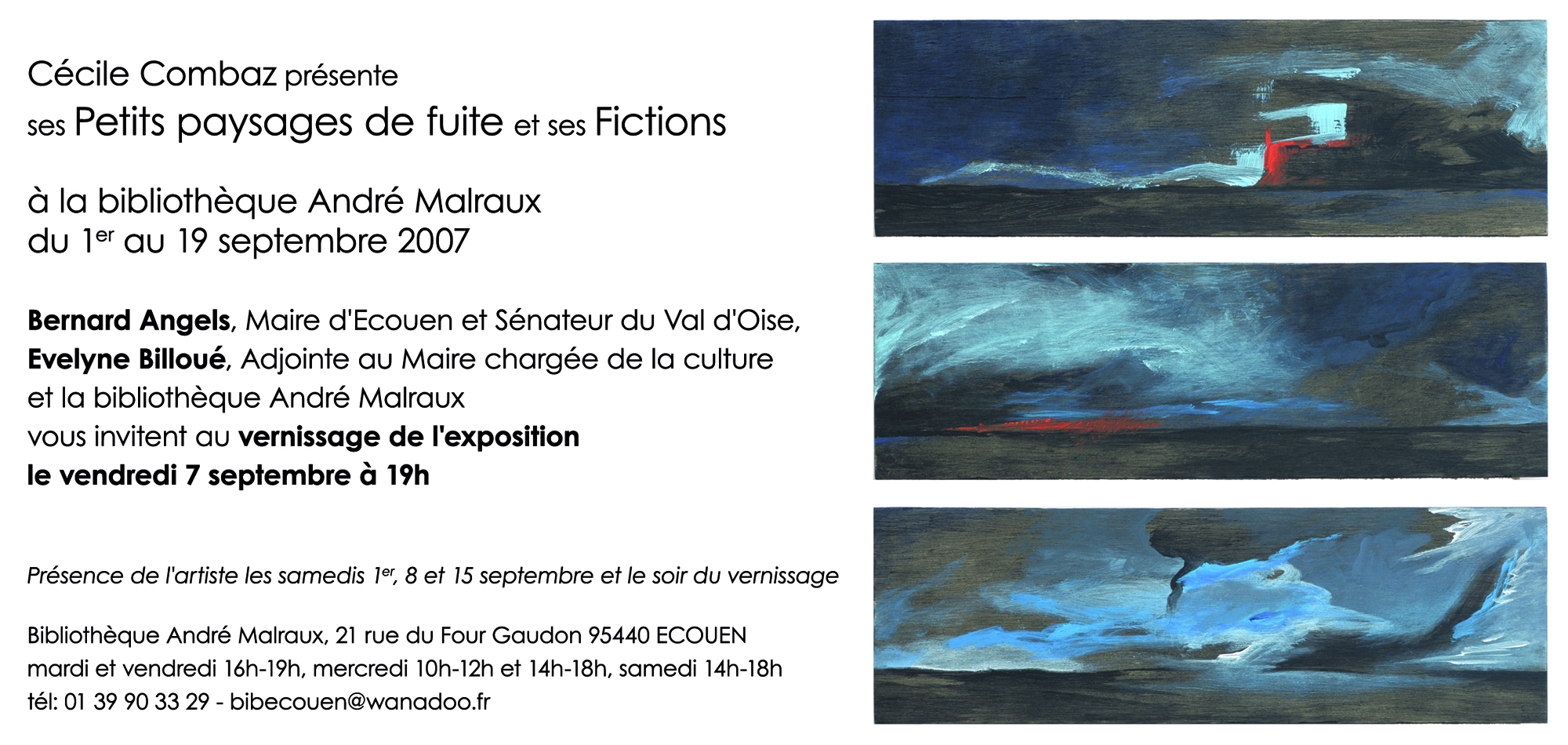 Exposition des Petits paysages de fuite (peintures) et des Fictions (gravures) dans le bel espace ouvert de la bibliothèque André Malraux d'Ecouen.